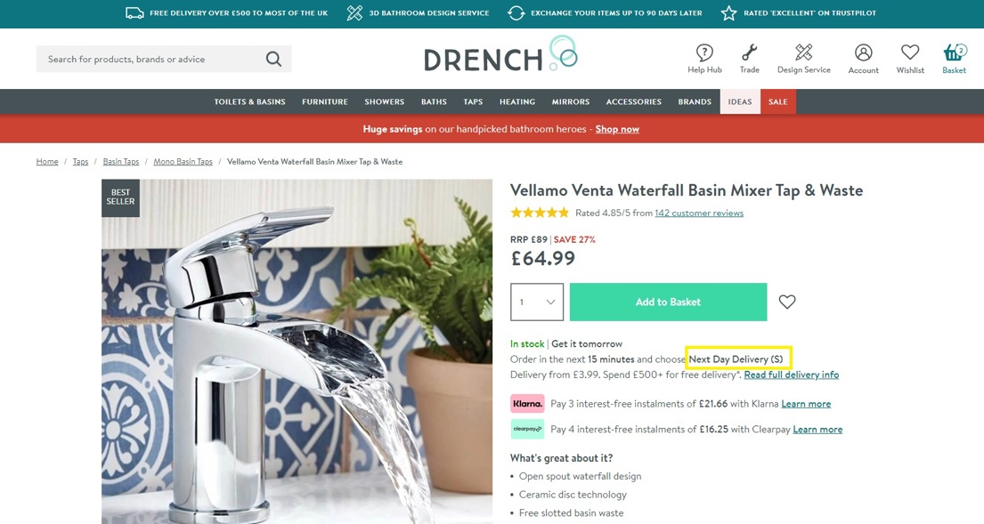 You can order small items (taps, shower fittings, accessories etc.) to most of Europe. You’ll be informed if any of the items in your basket are not able to be sent to your country during the checkout process. Please be aware that our delivery charges don't include custom charges for the country you live in.