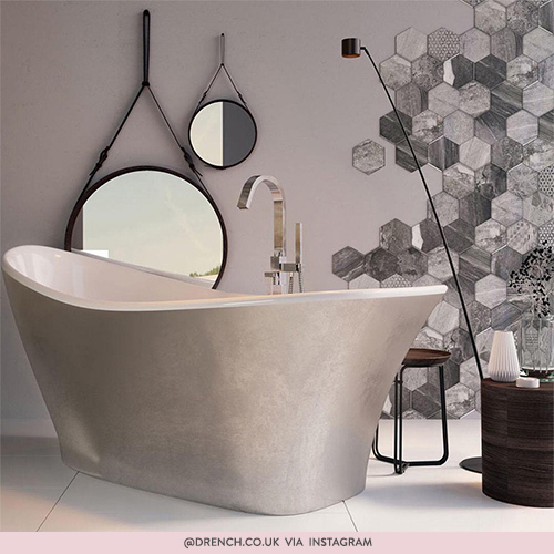 Honeycomb tiling looks mesmerising no matter what it’s paired with, but the different marbles and patterns compliment the silver bath perfectly and don’t distract from its beauty. The subtle and minimalist grey wall only adds to the overall picture. A look that should inspire us all!