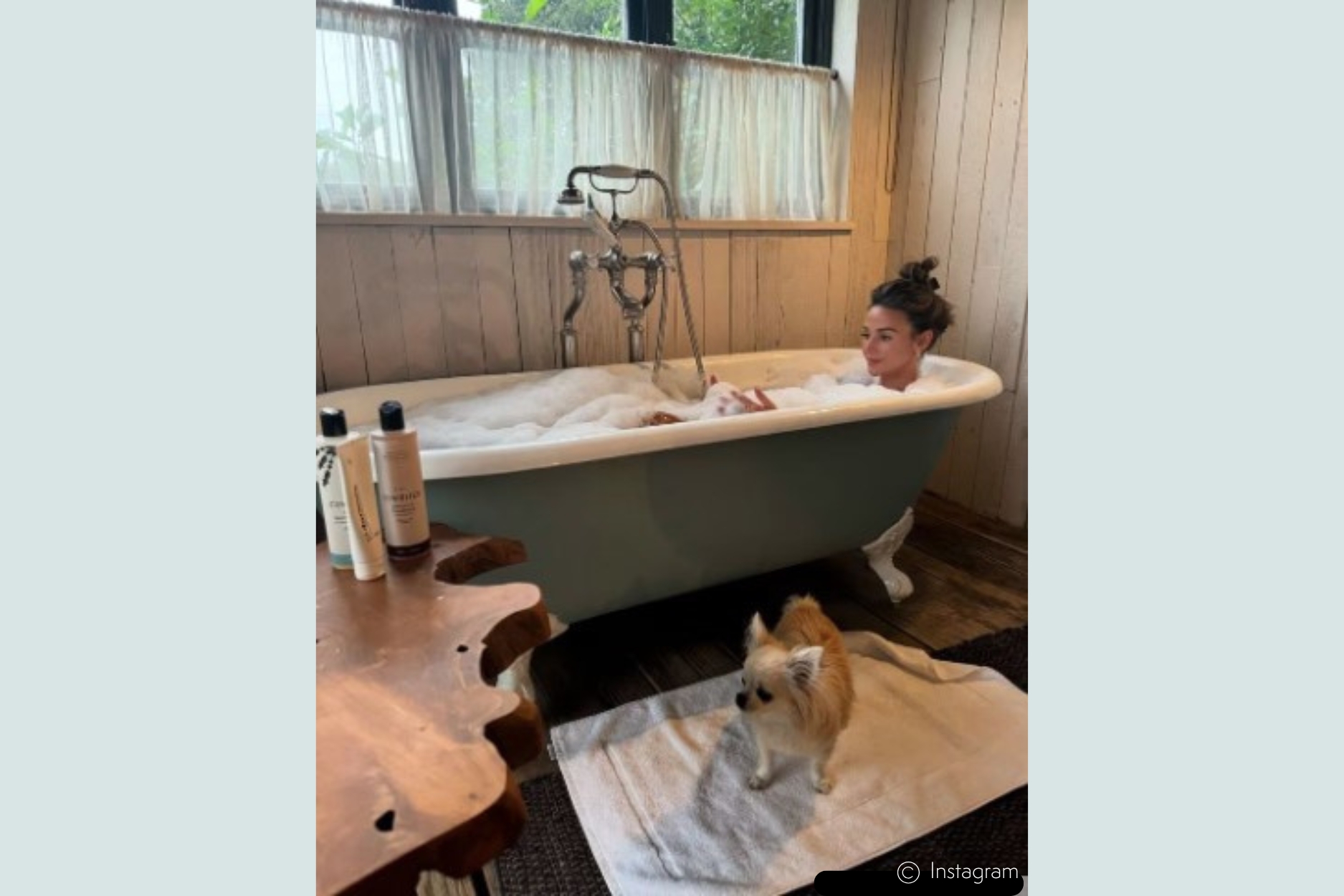 Michelle shared a snap to her Instagram recently as seen here in hello magazine showcasing a relaxing moment in her freestanding roll top bath with a stunning period-inspired bath shower mixer. She's also gone for a rustic feel to her walls, flooring and additional décor with wooden touches.