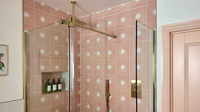We collaborated with Ellie from @sevenpalmtreehouse to help her achieve this gorgeous bathroom transformation. The beautiful bathroom features glorious pink tiles paired with Crosswater MPRO brassware and layered with soft light wood touches. -